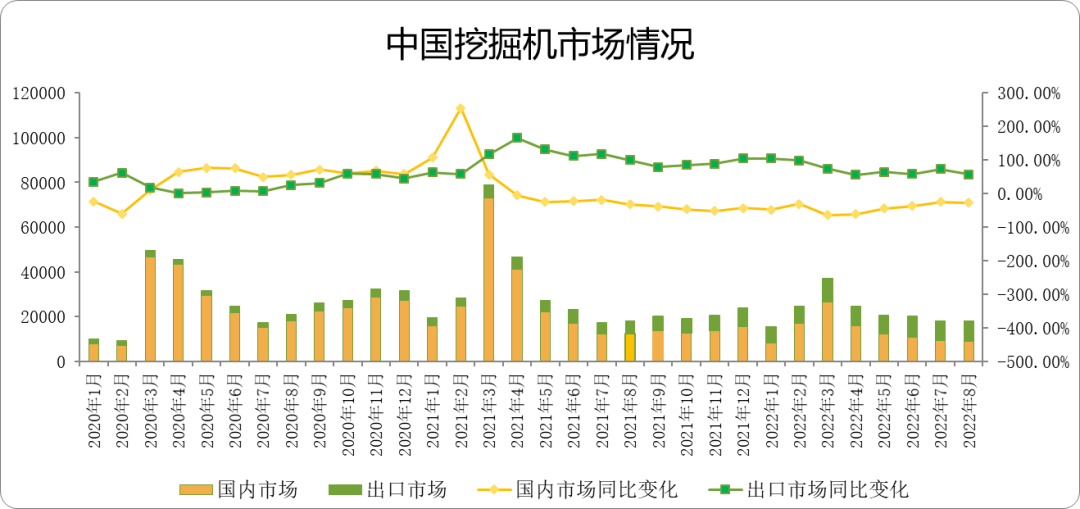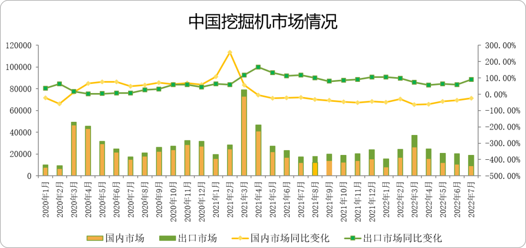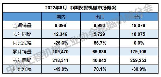 根據中國工程機械工業協會行業統計數據,2022年1—8月納入統計的26家主機制造企業,共計銷售各類挖掘機械產品179,109臺,同比下降30.9%。其中,國內市場銷量109,470臺,同比下降49.9%;出口銷量69,639臺,同比增長70.…......