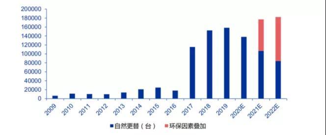 預(yù)計2020-2022年國內(nèi)挖機銷量中,更替需求分別為13.80萬臺、17.71萬臺、18.24萬臺,2021-2012年占比高達30%、50%。