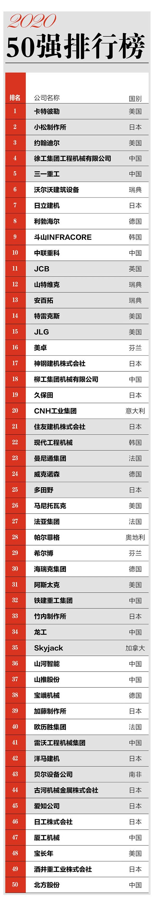 日前,2020年全球工程機械制造商50強排行榜在北京發布。截至2020年,由《中國工程機械》雜志制作的“全球工程機械制造商50強榜單”,已經連續發布19屆。
