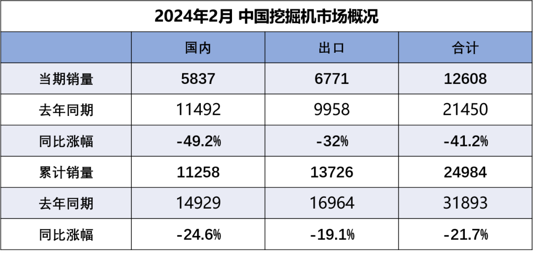 據中國工程機械工業協會對挖掘機主要制造企業統計,2024年2月銷售各類挖掘機12608臺,同比下降41.2%,其中國內5837臺,同比下降49.2%;出口6771臺,同比下降32%。
